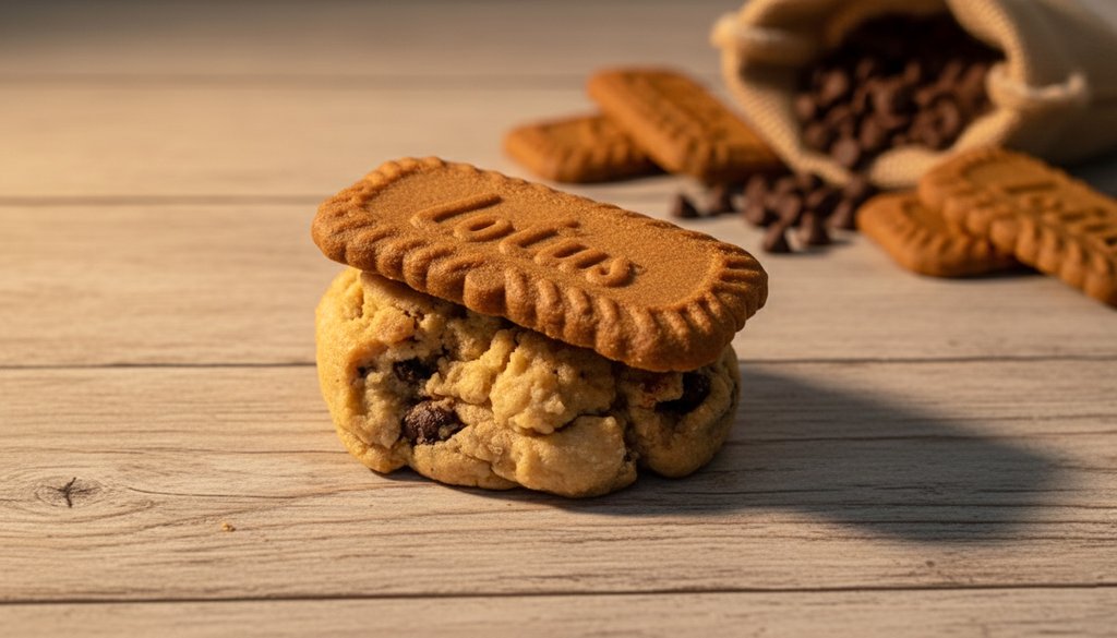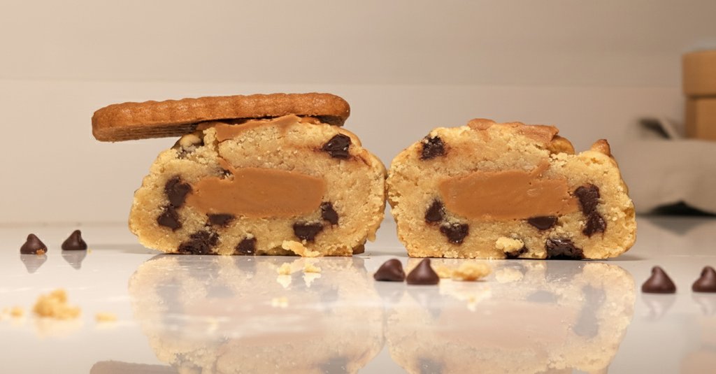 Una galleta NY doradita, tierna y con el punto justo de caramelo, cargada de pepitas de chocolate blanco. En el centro, un cremoso relleno de crema Lotus que aporta ese sabor especiado a canela y caramelo que enamora desde el primer mordisco. Pura tentación.